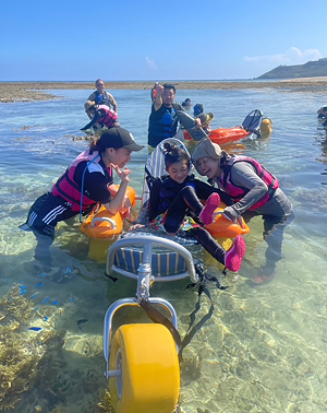 沖縄の美しい自然の中で、アクティビティにチャレンジしたり、透き通った海の中でたくさんのお魚に触れたり、非日常の体験ができます。安全に設計されたバナナボートや、海の中に入れる車いすなど、安心してマリンスポーツが楽しめます。