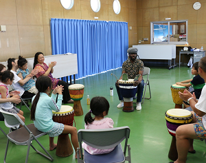 3回目の留学1日目は、南城市の「あざまサンサンビーチ」で、マリンスポーツをたっぷり体験。透き通った海の中でたくさんのお魚に触れたり、初めてのバナナボートで大はしゃぎでした。2日目は、ゲーム感覚で英語をお勉強、午後はナイジェリアの伝統太鼓をネイティブの先生と一緒に楽しみました。