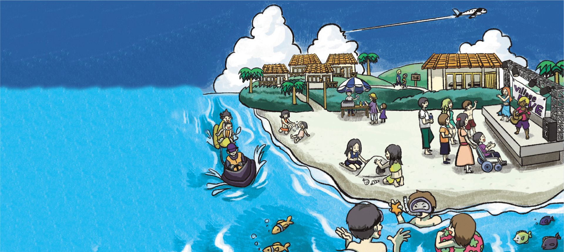 現在「英語と海とぼくらの学校」は、沖縄のリゾート施設などにご協力いただき、留学ツアーを実施しています。2026年夏までに沖縄に学習棟4棟と宿泊コテージ15棟、アクティビティ施設など、小さな村をイメージした複合施設「英語と海とぼくらの学校」を建設し、全国の障がい児の留学希望を募ります。今後、クラウドファンディングでご支援のお願いをしていく予定です。この活動にご賛同いただける方は、ぜひご支援をお願いいたします。